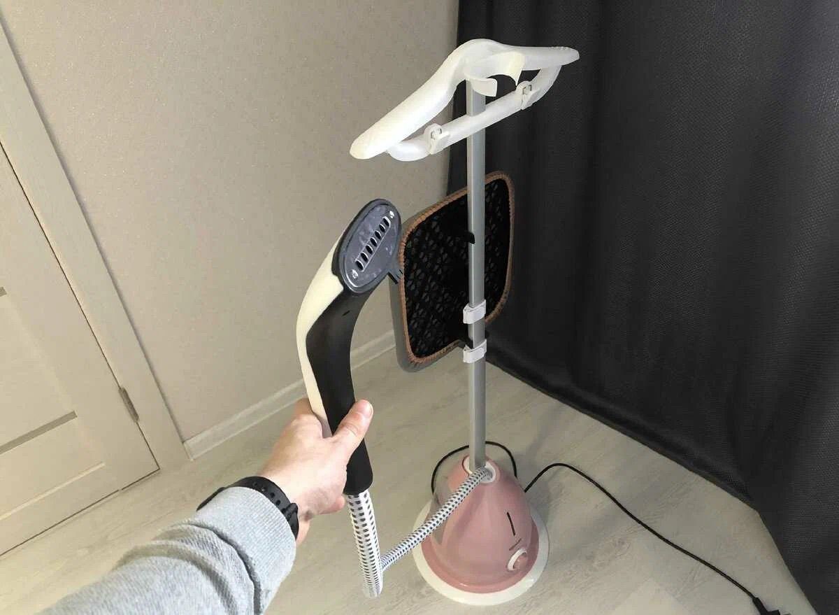 Это более крупный прибор на стойке, с шлангом и утюжком-паровой головкой. У него есть собственная вешалка, иногда небольшая гладильная доска-сетка для воротников и карманов. Размеры ощутимые – место для него нужно выделить, хранить вертикально. Зато пользоваться дома очень удобно: не надо держать весь прибор на весу, только легкий утюжок на шланге. Напольные модели мощнее и за один раз отпаривают больше вещей. Мне, например, напольный отпариватель помог быстро привести в порядок сразу три костюма подряд – ручной бы пришлось заправлять водой несколько раз.