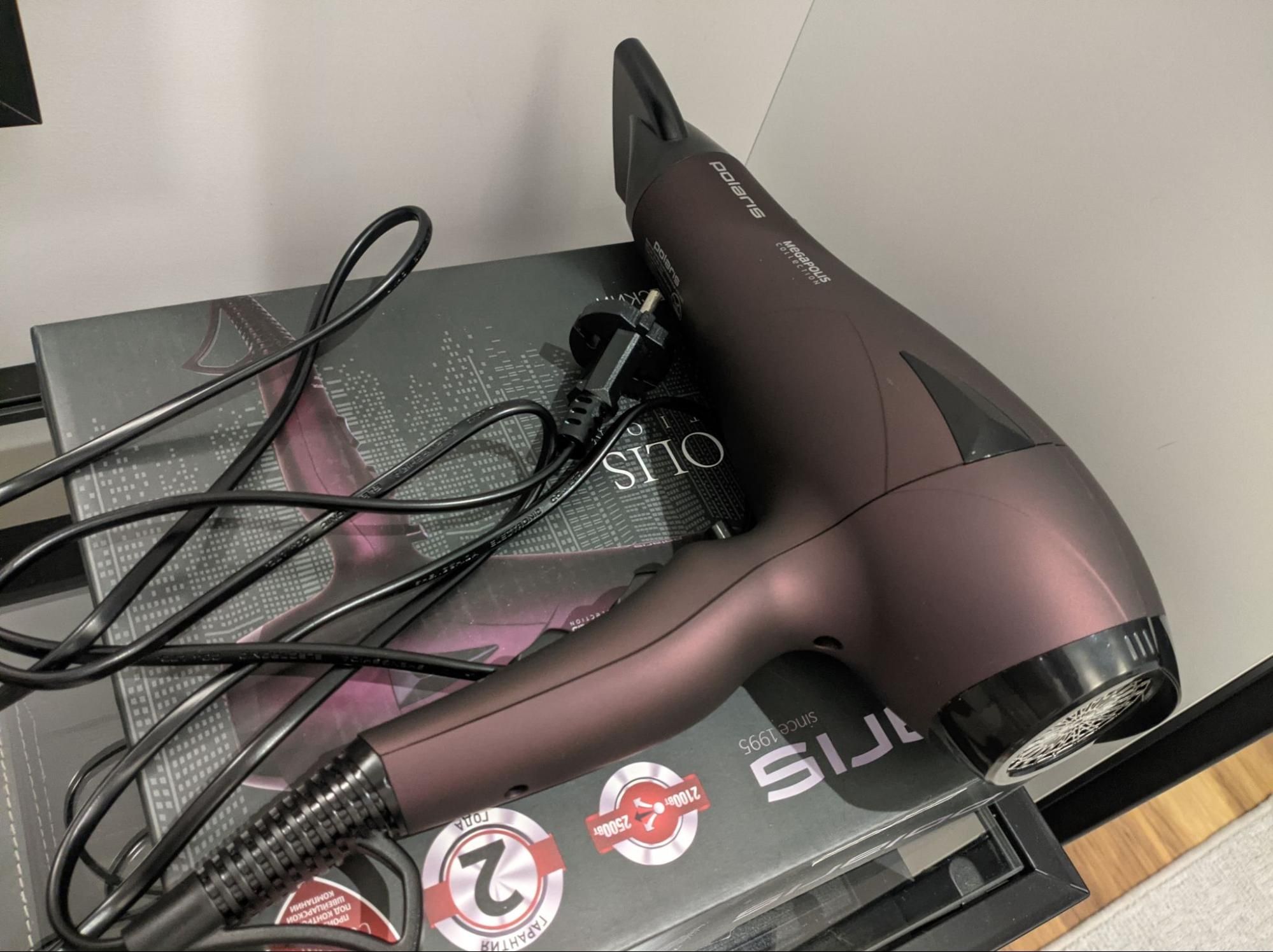 Polaris PHD 2245Ti — «туристический» вариант с максимальной мощностью 2200 Вт. Несмотря на значительные Ватты, он весит всего около 610 г. Это делает его удобным для путешествий и хранения. Устройство простое: есть три температурных режима, две скорости и ионизация для гладкости. Откидная петелька позволит легко повесить его на крючок, а корпус с покрытием Soft Touch приятен на ощупь и не скользит. В сравнении с предыдущими героями, у 2245Ti меньше наворотов: одна насадка-концентратор и никаких «суперфишек». Зато вилка складная, так что он компактно складывается. Недостатков немного — только привычный минус «путешественников»: мотор не такой долговечный, как в профессионалах, но для дома и поездок его хватит.