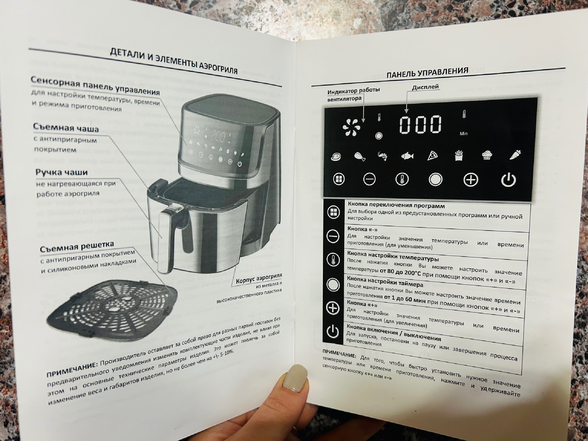 - Важно отметить: если на улице очень холодно, погрейте аэрогриль 2–3 часа при комнатной температуре перед использованием. Это убережёт детали от конденсата.