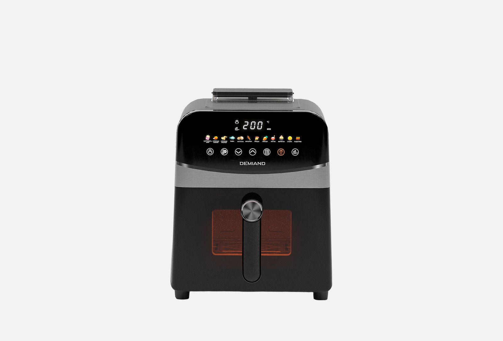 Напоследок – самая необычная модель в нашем топе. Аэрогрили DEMIAND стали известны в 2025 году благодаря агрессивной рекламе инноваций. Sanders MAX – это мощный аэрогриль объемом 9 литров с функцией подачи пара во время готовки. Название явно отсылает к легендарному полковнику Сандерсу (жареная курочка), и аппарат претендует жарить так же хорошо. У него двойной нагрев: верхний ТЭН 1450 Вт + нижний 500 Вт, итого суммарно около 1950 Вт. Плюс есть встроенный парогенератор (Steam Fry-Up) – можно налить воду в бак и при готовке нажать кнопку «Пар». Тогда во время жарки периодически впрыскивается горячий пар. Зачем это нужно? Пар помогает блюдам не пересыхать и готовиться быстрее. Например, мясо получается особенно сочным внутри, а снаружи все равно зажаривается корочка. По заявлениям Demiand, технология позволяет готовить на 30% быстрее, чем в обычной духовке, и без потери влаги.