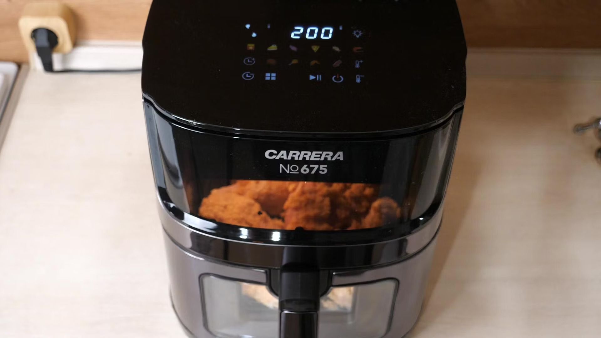 Стильный и продуманный аэрогриль от немецкого бренда Carrera. Модель №450 удивляет сочетанием цены и возможностей. Объем чаши 7,2 л – это действительно много (производитель шутит, что помещалась 4-килограммовая щука, и это правда). В то же время цена около 8 тыс. ₽ делает его крайне привлекательным для такой вместительности. Мощность 1800 Вт, воздушная конвекция 360° и 3D-нагрев дают отличный результат: хрустящая корочка снаружи, сочность внутри. У Carrera 450 8 программ и ручные настройки; при этом диапазон температур уникально широкий: 40–200°C с шагом 5°. Можно томить продукты на 60° (например, готовить по технологии су-вид), делать йогурт при 40°, или, наоборот, жарить на 200°. Приятный бонус – смотровое окно с подсветкой на передней панели, как у духовки. Через него реально видно процесс, не надо вынимать чашу. Корпус и чаша сделаны добротно: есть двойное стекло (наружное не обжигает руки), антипригарное покрытие, все части снимаются и моются.