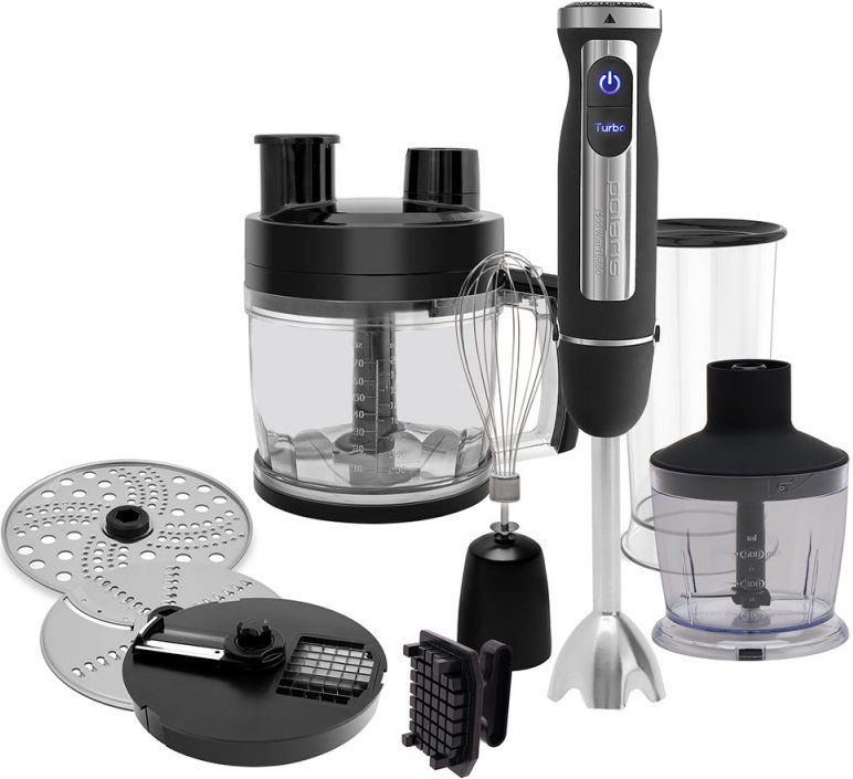 Мощный погружной блендер Polaris PHB 1594 – настоящий «троеголовый» боец кухни. Мотор 1500 Вт и 15 скоростей легко справляются даже с твердыми ингредиентами. В комплекте – прочный металлический погружной узел и насадки: венчик и измельчитель на 0.5 л (думаю, можно разогнать хоть тесто для пиццы!). Мерный стакан на 700 мл тоже в наборе. Опыт использования подсказывает: эта модель сочетает силу и компактность, за которую многие без ума. Цена: около 3000–3500 руб.
