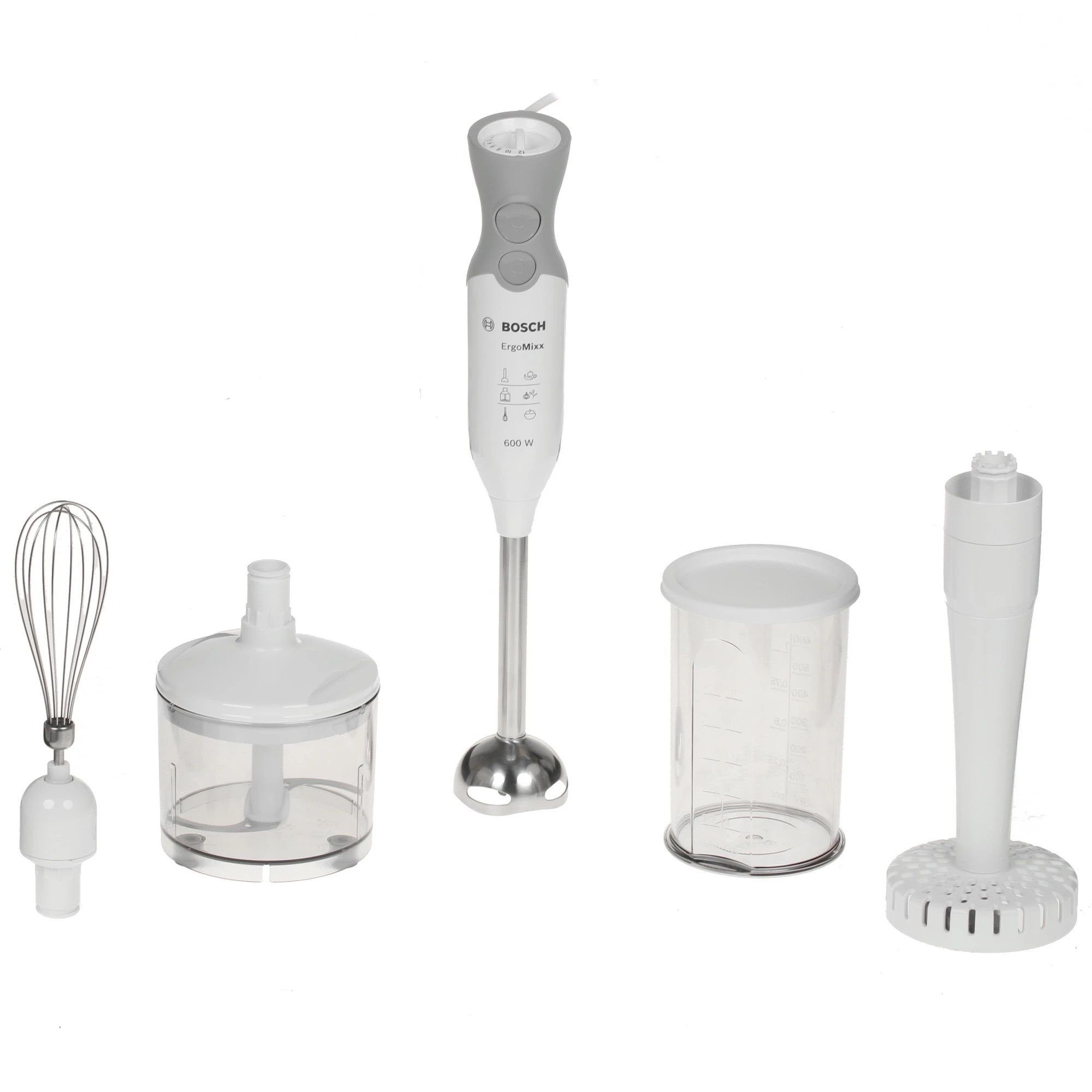 - Bosch MSM66110 (600W) – простой погружной блендер с 600 Вт и одной скоростью. Имеет насадку-измельчитель и венчик, лёгок и недорог, хорошо подойдёт для повседневных супов и смузи. (Цена ≈ 2 000 руб.)