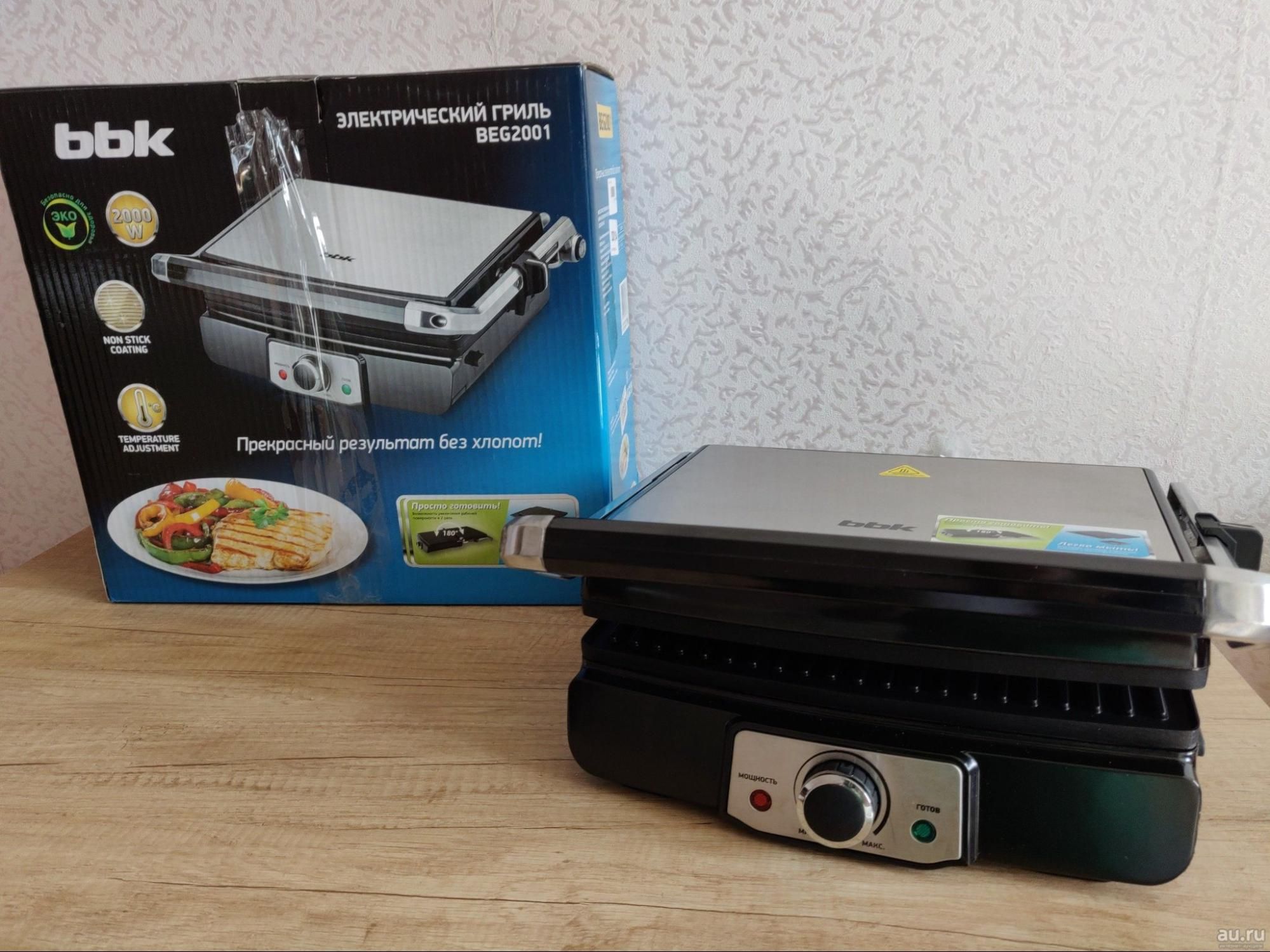 Недорогой и компактный электрогриль от BBK, который порадовал многих хозяек. У BBK BEG2001 простая механика: поворотный переключатель позволяет выставлять температуру нагрева (максимум около 210 °C). Мощность 2000 Вт для своей цены очень достойная — гриль быстро разогревается и может зажарить мясо до корочки. Жарочные панели здесь съёмные, с антипригарным покрытием: их легко снять и помыть, даже вручную особо не напрягает. Рабочая поверхность 29×23 см — поместится сразу несколько порций (например, 3–4 стейка средней величины). Гриль раскрывается на 180°, верхнюю половину можно использовать как отдельную жарочную поверхность. В крышке есть фиксация под разными углами — удобно для запекания бутербродов или чтобы жарить, не соприкасааясь с продуктом (например, сэндвичи не сплющит). При всём функционале аппарат довольно лёгкий (менее 4 кг), но важно отметить, что хранить его можно только горизонтально (вертикальное хранение не предусмотрено).