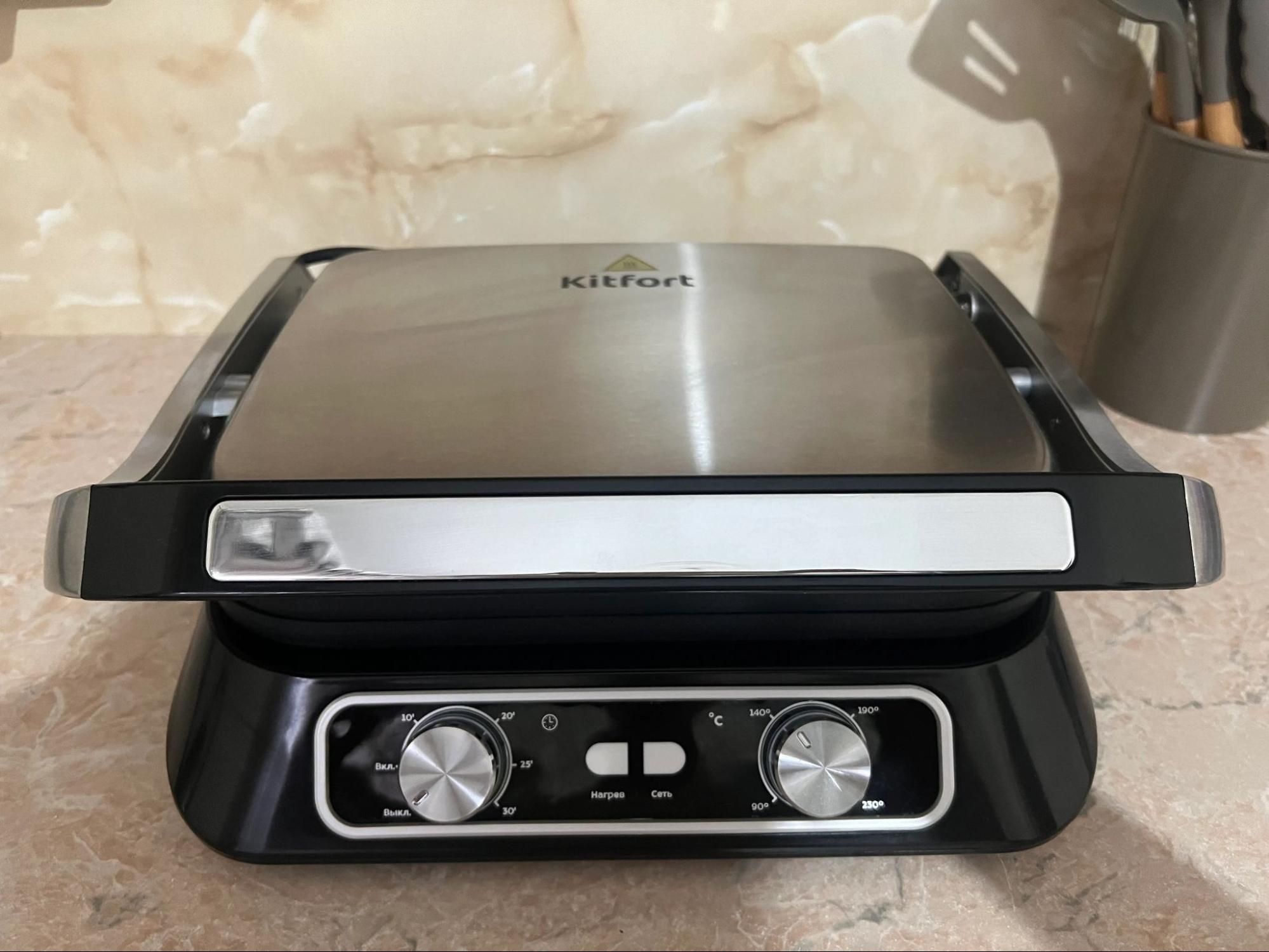 Рифлёные панели , обеспечивают красивые полоски на стейках. Гриль раскрывается «книжкой» на 180°, можно готовить сразу на обеих поверхностях, увеличивая выход. Поддон для жира имеется, он съемный и легко чистится. Вес у модели средний (около 5 кг), она устойчива. По отзывам владельцев, Kitfort KT-1652 радует быстрым приготовлением и тем, что ничего не пригорает — панели качественные. Важно: нагревательный элемент у этой модели встроен в корпус, а не в пластины, так что после остывания панели можно спокойно отстегнуть и помыть в раковине.