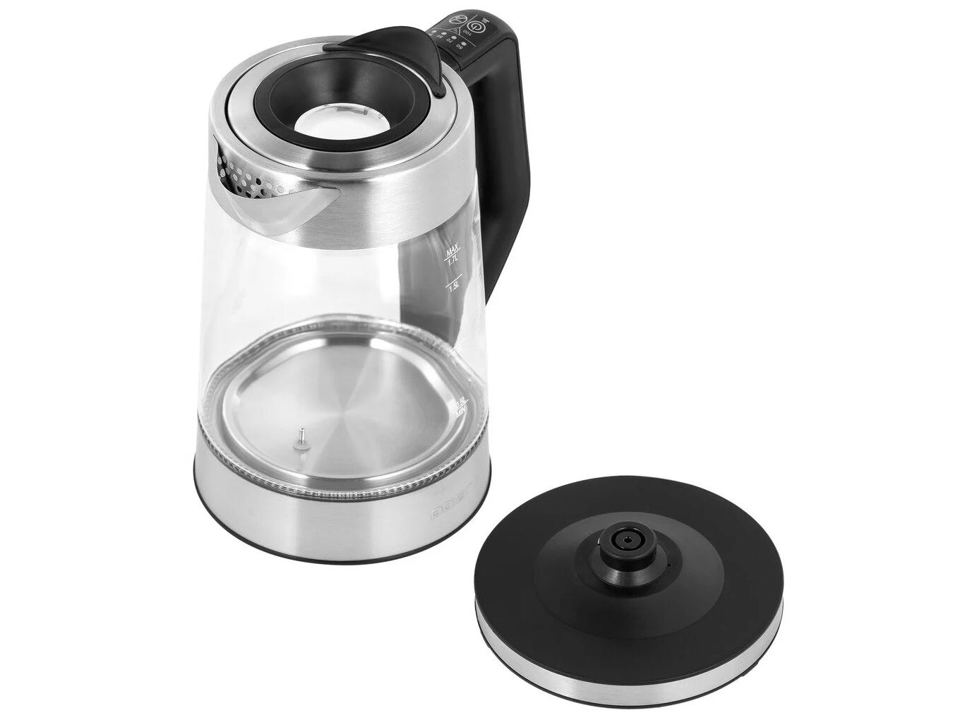 Чайник выполнен в современном стиле: стеклянный корпус с металлической окантовкой и индикаторной подсветкой. Цвет подсветки меняется в зависимости от температуры воды, что не только красиво, но и практично — одним взглядом видно, насколько горячая вода внутри.