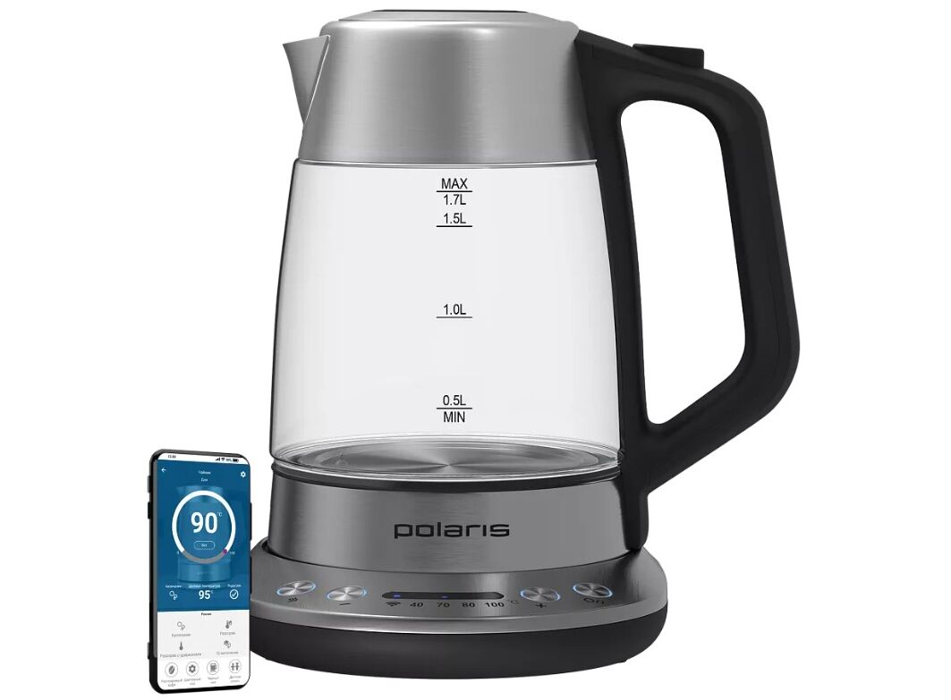 Корпус выполнен из термостойкого стекла с металлической окантовкой. Объём привычный — 1,7 литра. Подключение к приложению Polaris IQ Home открывает все смарт-возможности: от точного выбора температуры (с шагом 5 °C) до расписания кипячения. Поддерживаются голосовые ассистенты — Яндекс.Алиса, Маруся и Салют.