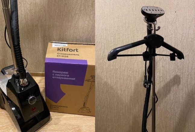 Благодаря такой конструкции Kitfort KT-970 отлично справляется с плотными вещами – пользователи успешно отпаривают им и пиджаки, и зимние пальто, и даже мебельную обивку освежают горячим паром. Передвигать отпариватель легко: есть прорезиненные колесики, длинный кабель (~2,2 м) дает свободу маневра, а телескопическая стойка регулируется по высоте под рост пользователя.