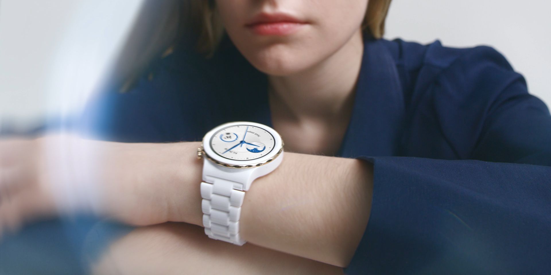 - Роскошный дизайн: белая керамика и золото – часы выглядят как ювелирное украшение, выделяются среди типовых гаджетов.