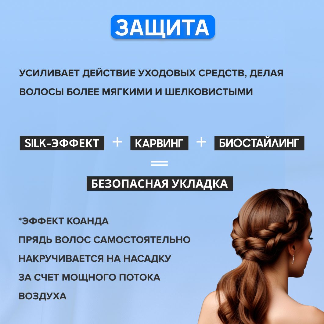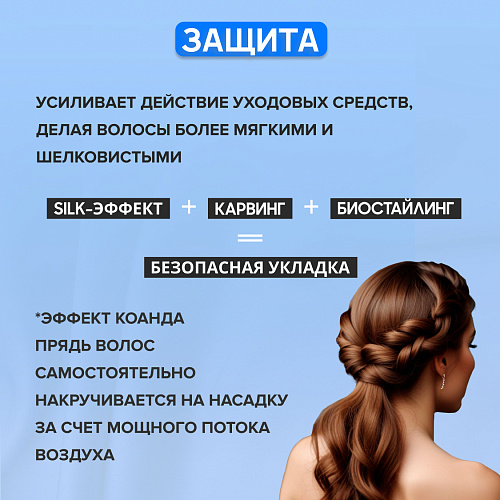 СИЛК-эффект для борьбы с секущимися волосами Высокая скорость потока воздуха закрывает чешуйки волос и делает их идеально гладкими. Сохраняет нужный уровень воды в волосах и убирает ломкость, усиливает действие уходовых средств.