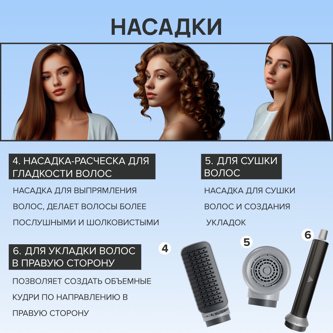 Полная свобода творчества 6 насадок в комплекте: можно создавать разные образы ежедневно. Для работы и праздничных мероприятий.