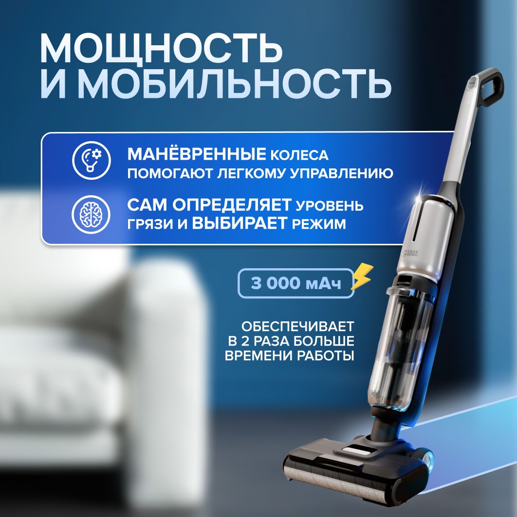 Сила вне конкуренции Высокая мощность всасывания 15 000 Па — эффективно всасывает пыль и крупные загрязнения.