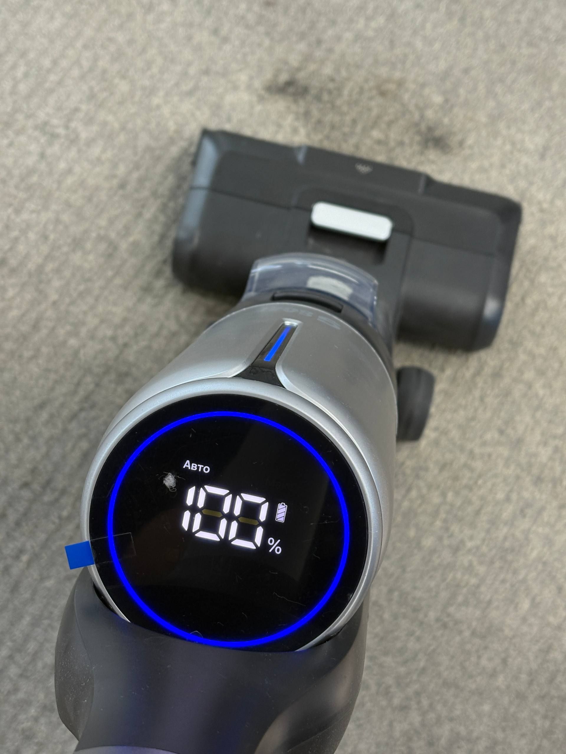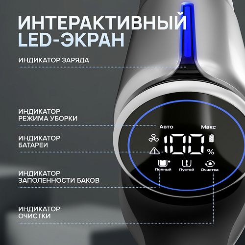 LED-дисплей отображает: режим уборки, заполненность резервуаров и процент заряда в цифрах.