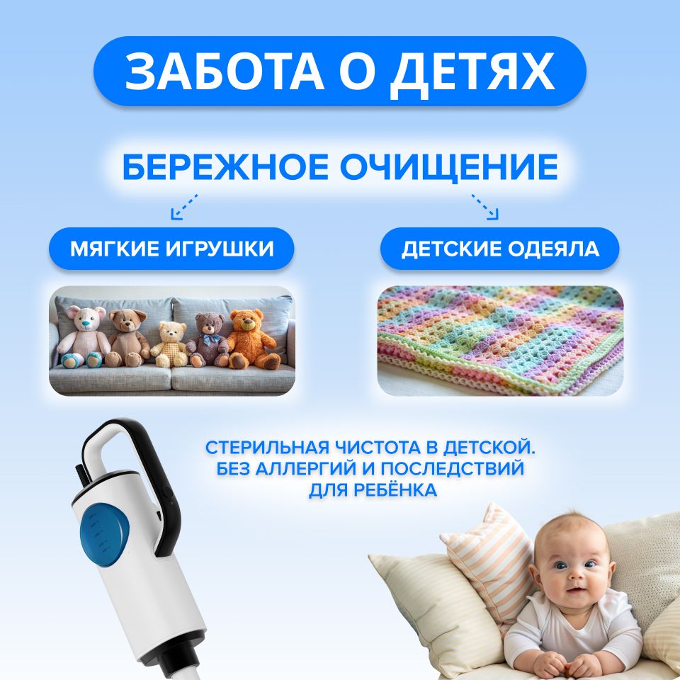 С заботой о детях Отпаривает мягкие игрушки, детские подушки, одеяла, окна в детской – всё, что следует беречь от бытовой химии. Стерильная чистота в детской и без аллергий и последствий для ребёнка.