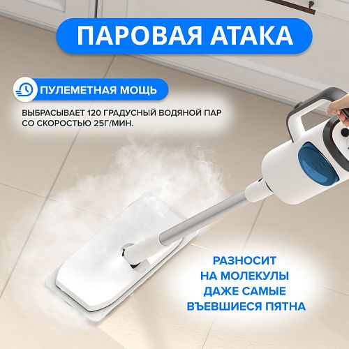 Паровая атака Генерирует стерильно чистый пар 120+ °C. Дезинфицирует пол, ковер, ковролин, шторы, кастрюли, одежду, камеру СВЧ, духовку, ЛЮБЫЕ предметы и поверхности дома.