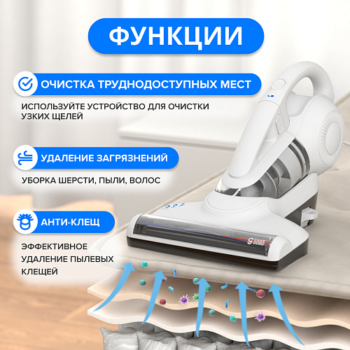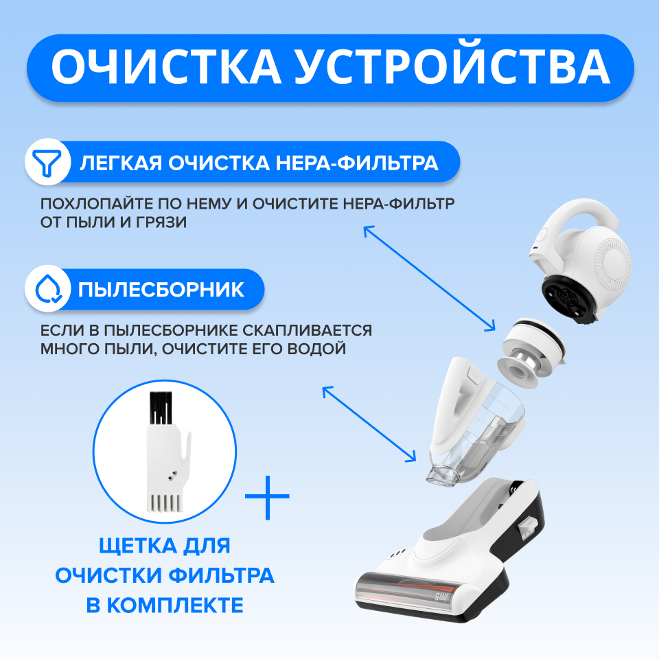 Вместительный быстросъемный пылесборник 300 мл — хватит на уборку 3-х матрасов / кроватей. Чистить бак — всего 5 сек.