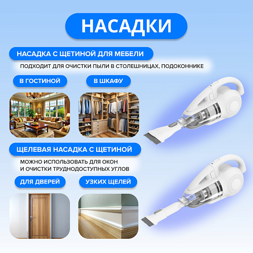 В комплекте идет специальная щелевая насадка для уборки пыли в щелях между подушками, промежутках между мебелью и стенами.