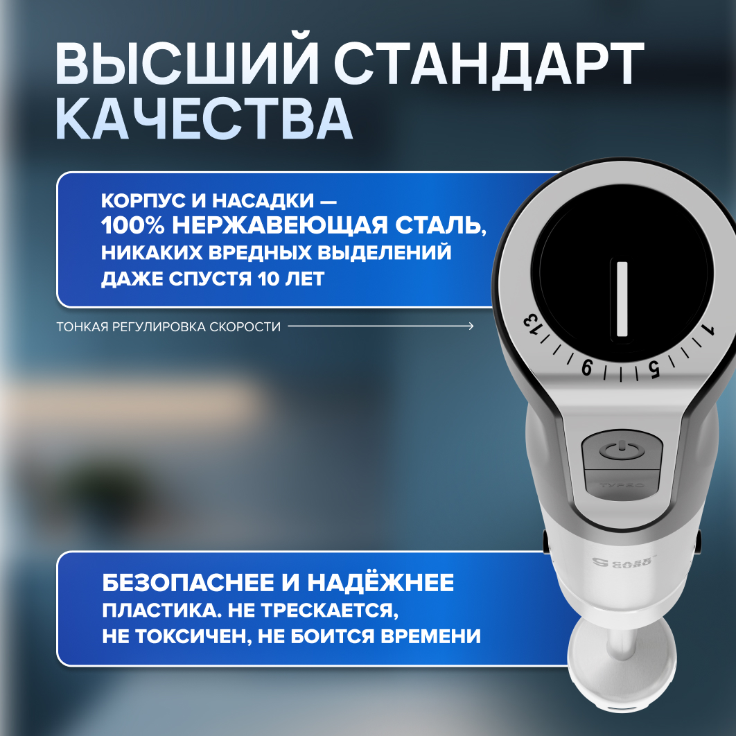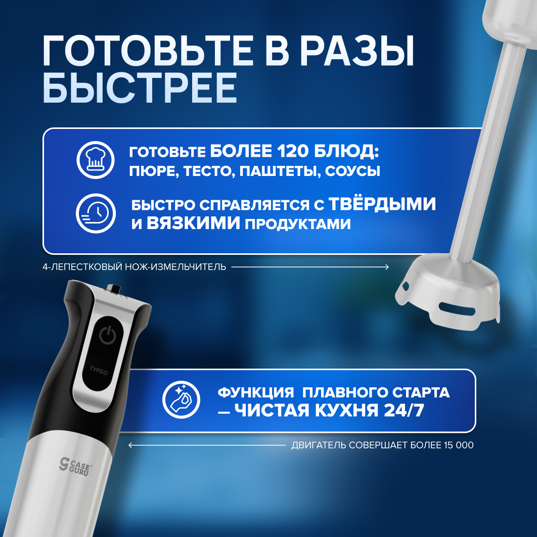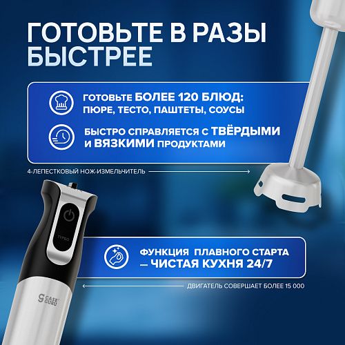 На верхней скорости двигатель совершает более 15 000 оборотов в минуту. Мощнее двигателя спортивного авто. Супы-пюре, соусы и смузи БЕЗ комочков!