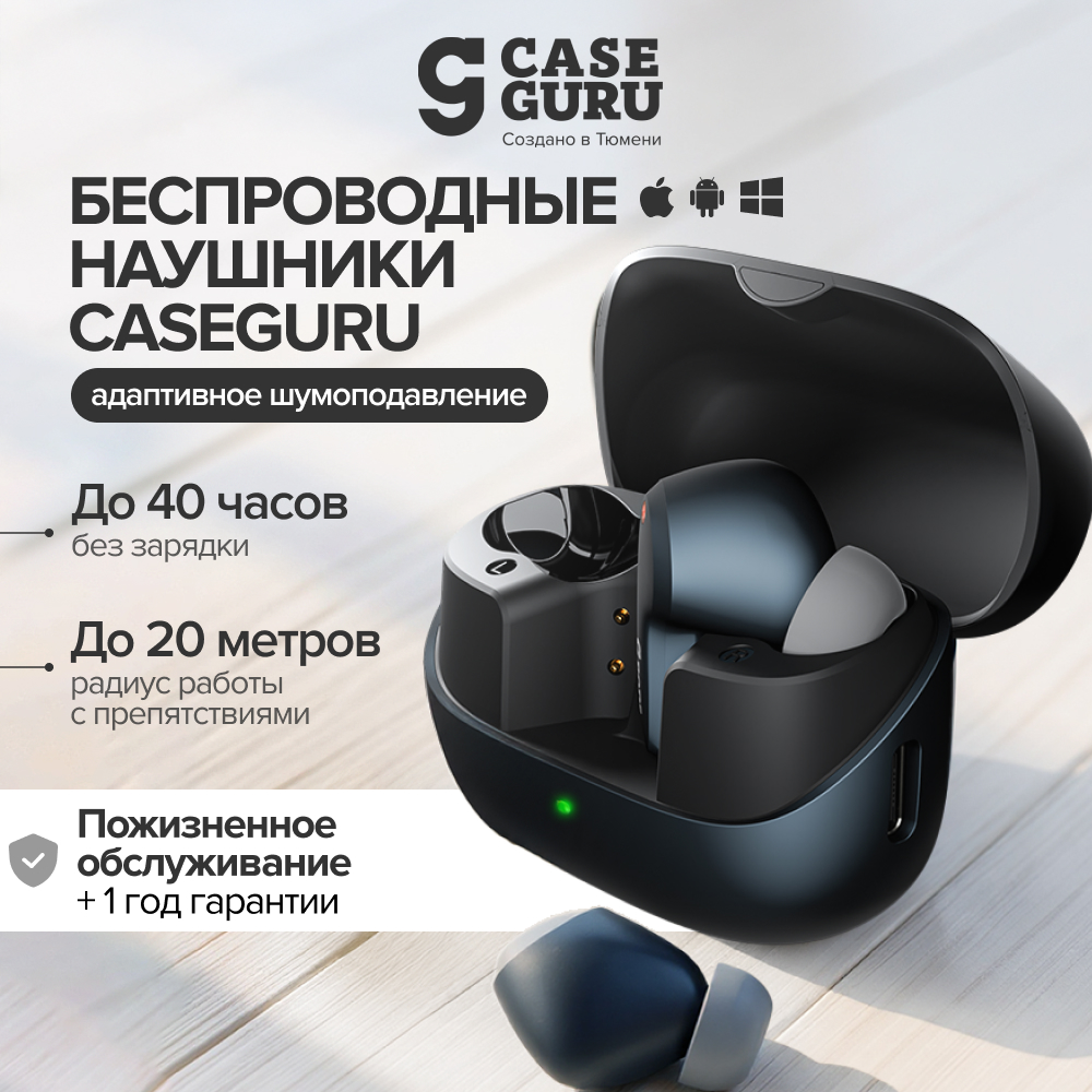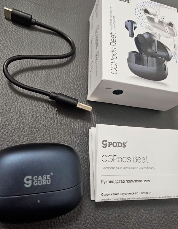 Беспроводные наушники CGPods Beat, кейс для зарядки, сменные амбушюры, кабель для зарядки Type-C, памятка о компании, инструкция на русском языке и гарантийный талон.
