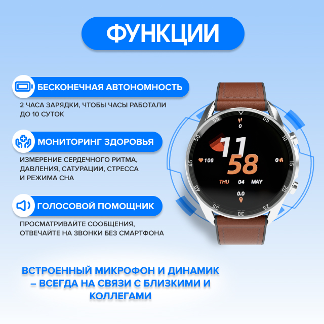 Встроенный микрофон и динамик – всегда на связи с близкими и коллегами Просматривайте сообщения, отвечайте на звонки и пользуйтесь голосовыми помощниками без смартфона.
