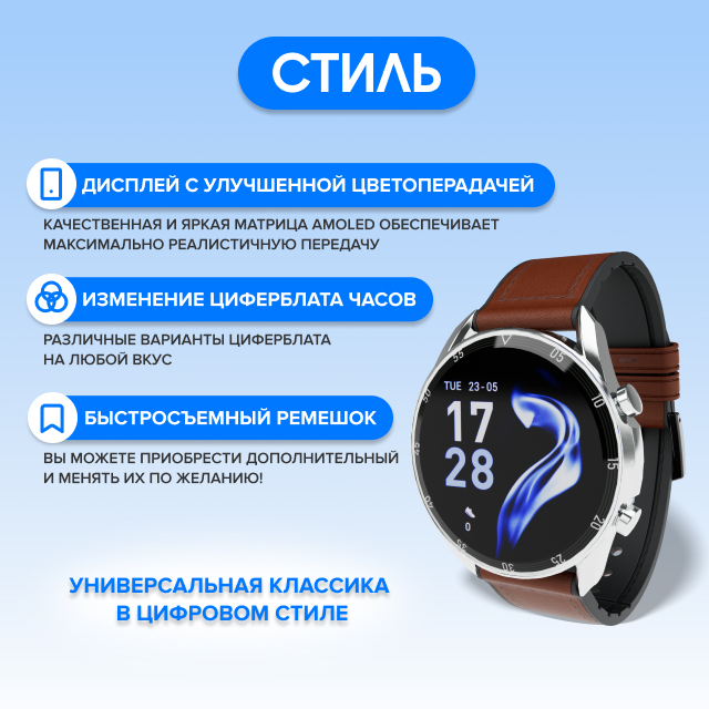 Индивидуальный стиль Готовые циферблаты и возможность создать свой уникальный фон для часов в мобильном приложении и добавить другую важную информацию.