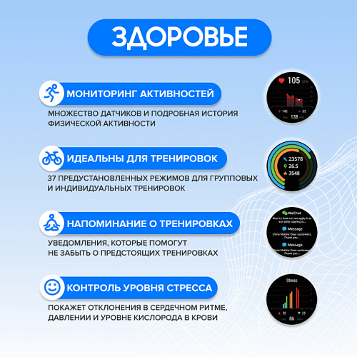Мониторинг стресса, состояния здоровья и физической активности Множество датчиков физической активности, качества и глубины сна для эффективного отдыха. Покажет отклонения в сердечном ритме, давлении и уровне кислорода в крови.